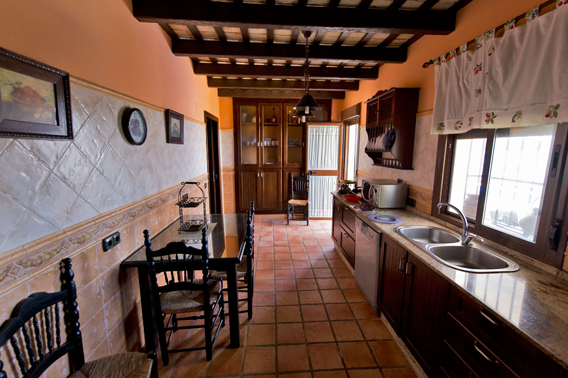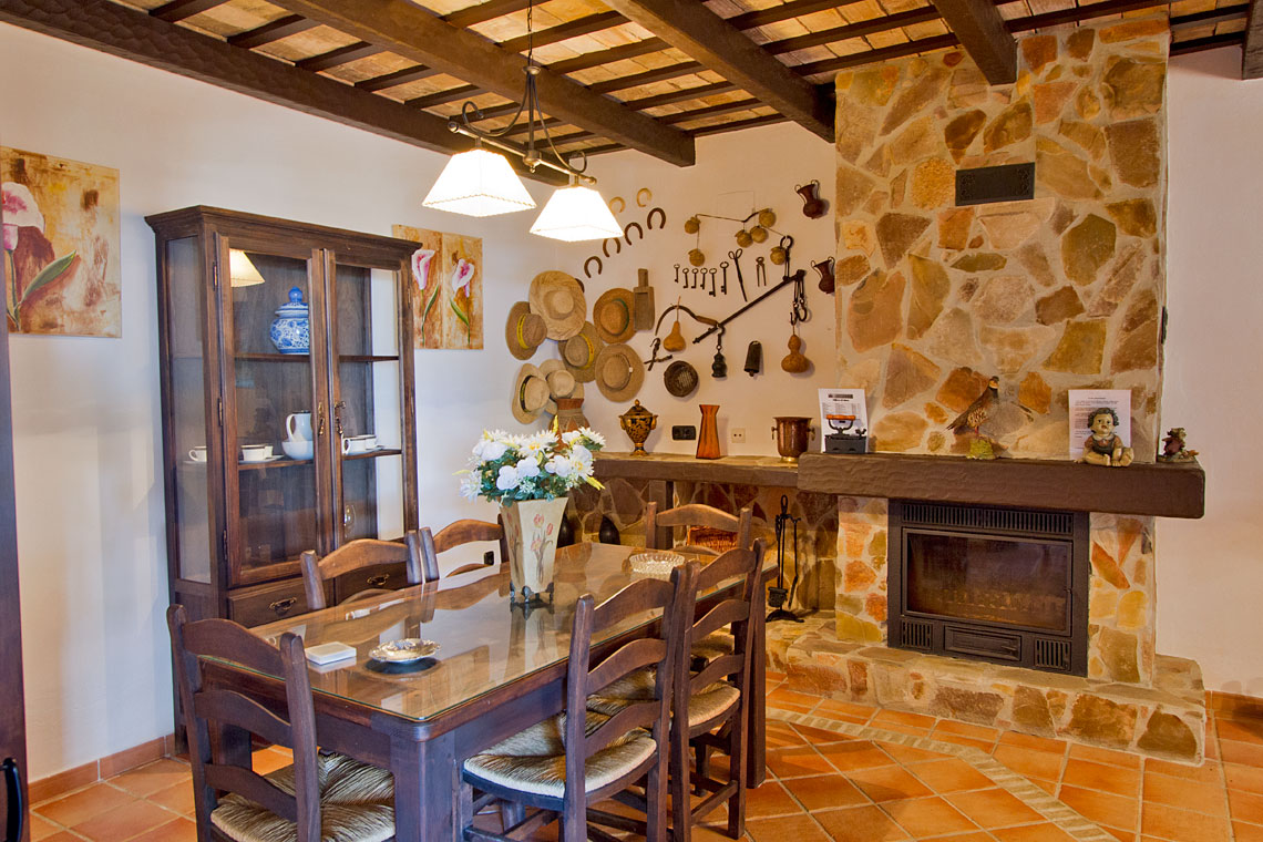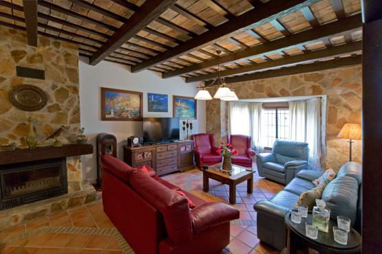 Das Ferienhaus erstreckt sich ebenerdig über ein Stockwerk. Die Innenräume sind im mediterranen Landhausstil erbaut und eingerichtet, dabei hell und geräumig. Im offenen Wohn- und Essbereich finden wir bequeme Ledersofas, einen großen Esstisch und einen schönen Kamin aus Stein