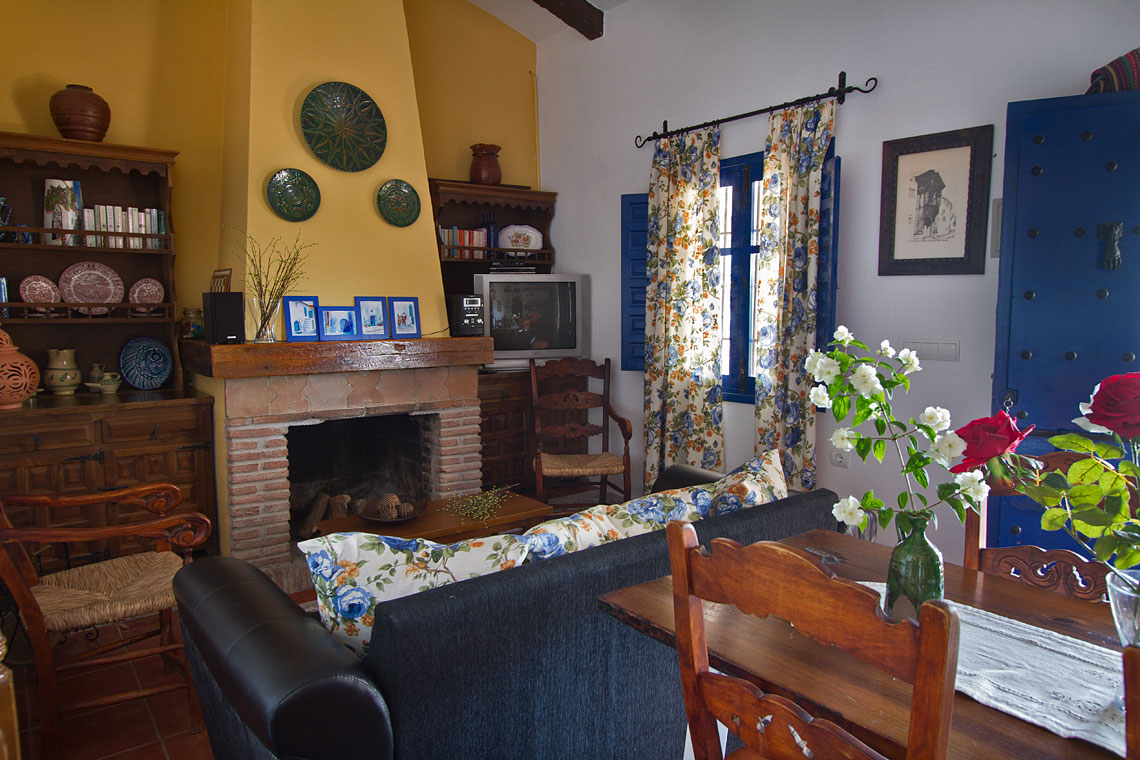 Die Innenbereiche sind im andalusischen Landhausstil erbaut und liebevoll eingerichtet. Die offene Küche hat eine Bartheke, der Wohnbereich hat Landhausmöbel aus Holz, ein Sofa und einen offenen Kamin